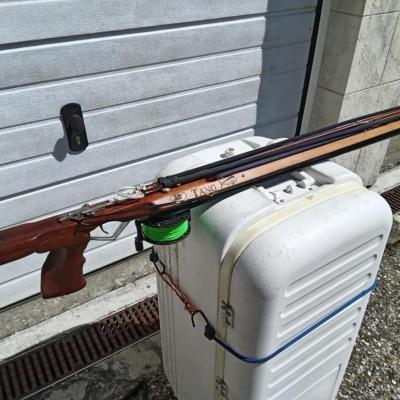 Il est ici monté avec une fleche de 7 mm inox Tri-cut Desiage 200 kg et mono fil 200°/°° ,double ardillons décallé .Moulinet grande capacité .Pour la propulsion un sandow 18 mm booster court en coefficient 4,5 rendu possible car la fleche a une encoche de chargement .On peut aussi mettre un double sandows de 16 mm en coefficient 3.5.
